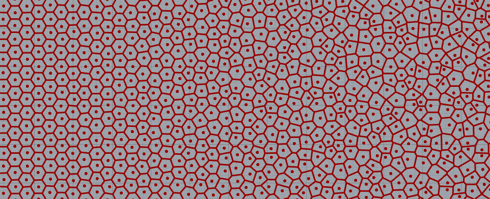 Another interesting application for Poisson Disk Sampling is providing base point inputs for Voronoi Diagrams. This fascinating topic appears widely in nature, art, architecture, and many other fields—certainly worthy of a separate post. A Voronoi Diagram is the "dual" of a Delaunay Triangulation, and can be constructed efficiently given a set of points in -dimensional space.